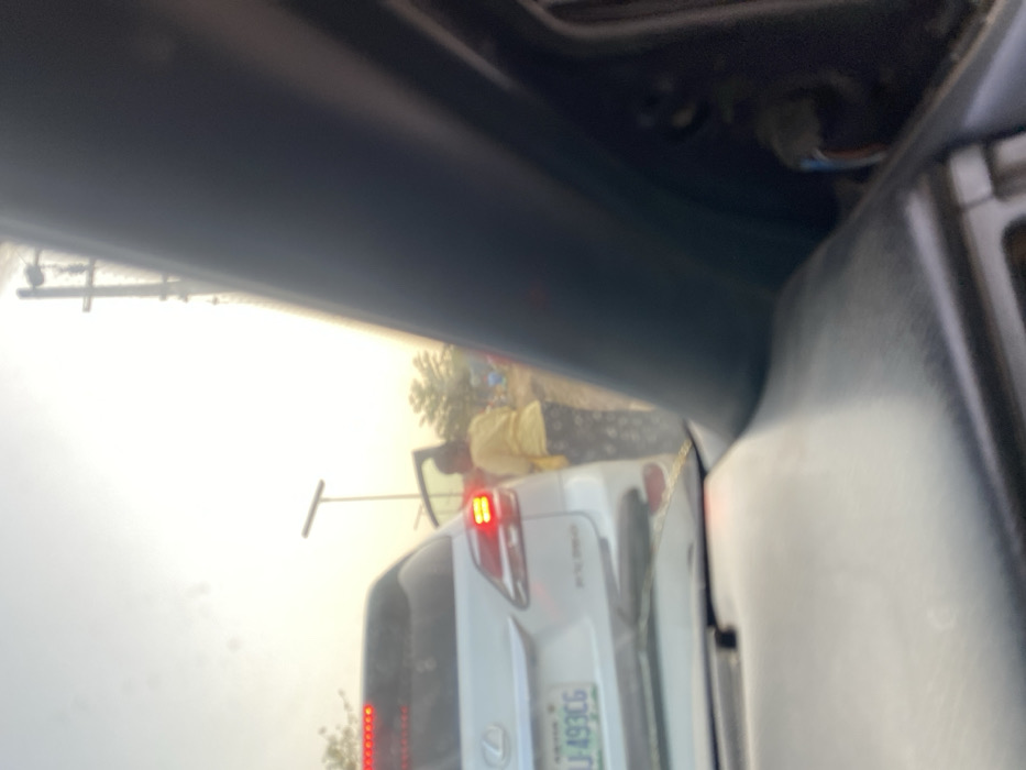 A view from inside a car shows a white Lexus SUV ahead, its taillights illuminated. A person wearing a yellow shirt and dark pants stands by the open driver's side door. The SUV's license plate is partially visible, with "LJ 493CG" discernible. Outside, a hazy sky suggests either dust or fog. A utility pole stands in the background. The view is partially obstructed by the car's interior, including the dashboard and part of the windshield.