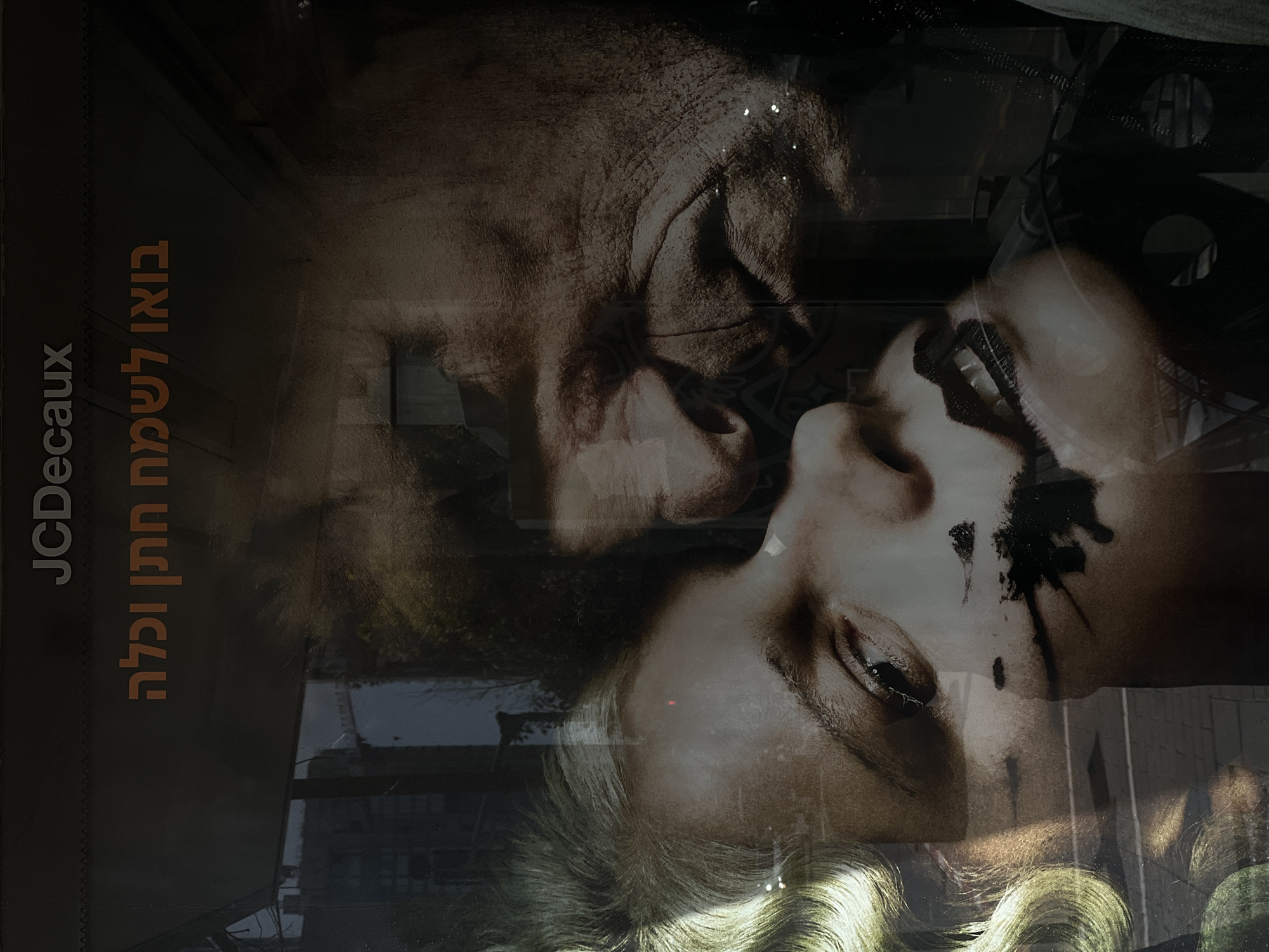 JCDecaux advertisement in Tel Aviv, Israel. The advertisement features an image of a man and a woman, their faces close together. The text "בואו לשמח חתן וכלה" (Bo'u L'sameach Hatan ve'Kallah) is written in Hebrew on the left side, which translates to "Come to bring joy to the bride and groom." The image is superimposed on the reflection of the street, including buildings and other urban elements.