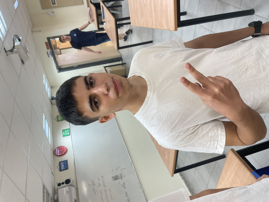 The image displays an indoor classroom or lecture hall in a city in Unknown, Unknown. In the foreground, a young male with short dark hair and light brown skin is wearing a white short-sleeved t-shirt with a faint circular graphic on the left chest. He faces the camera, making direct eye contact, and holds his right hand up to form a V-sign with his index and middle fingers. A dark wristband or watch is visible on his left wrist. In the background, another young male with short dark hair, wearing a dark blue short-sleeved t-shirt and dark shorts, is observed walking through an open doorway on the right side of the frame. The environment consists of white walls, a light-colored tiled floor, and a ceiling with recessed fluorescent light panels and a mounted projector. On the left wall, a white board displays writing in Hebrew. Adjacent to the whiteboard are an air conditioning unit and a speaker. Above the whiteboard, a red circular clock and two green square signs, also bearing Hebrew text, are affixed to the wall. Numerous rectangular desks with light wooden tops and black metal frames are arranged in rows throughout the room. An Israeli flag sticker is visible on the wall directly above the doorway.