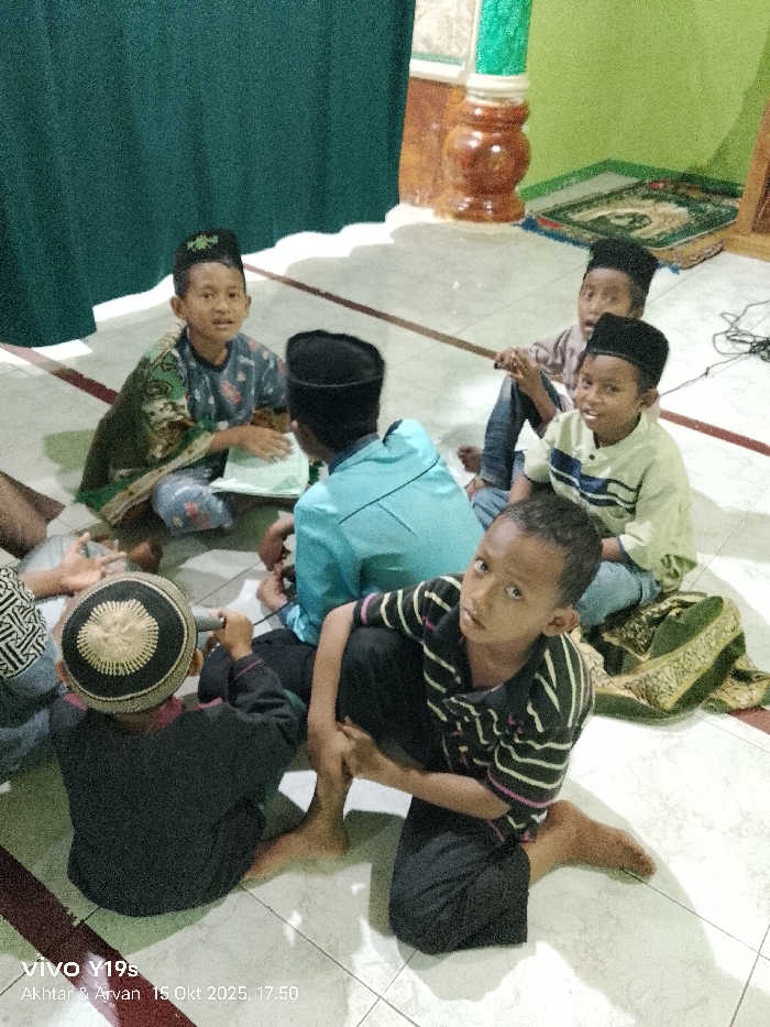 The image depicts an interior scene in a city in Wanguk, Indonesia. Seven young males, appearing to be pre-teen children, are seated barefoot on a light-colored tiled floor. In the foreground, a boy wearing a black and white horizontally striped shirt and black pants is positioned center-right, looking directly at the camera with his right knee bent. To his left, another boy with a black and beige patterned cap sits with his back partially to the camera, holding a small cylindrical object. In the mid-ground, a boy in a light blue long-sleeved shirt and a black peci (skullcap) is seen from behind, facing another boy to his left. This second boy wears a patterned green top and pants, a black peci with a green emblem, and holds a white book-like object, partially draped by a green patterned cloth. Further back on the right, two additional boys are seated. One wears a light beige collared shirt, blue jeans, and a black peci, smiling and looking towards the camera while seated on a folded green and gold patterned prayer mat. Behind him, another boy in a light brown patterned shirt, blue jeans, and a black peci is partially visible. An additional figure is partially visible on the far left. The background features light green walls and a dark green curtain. A decorative brown wooden pillar is visible behind the children on the right. Exposed black electrical cords are present on the tiled floor in the upper right. The scene is illuminated by ambient indoor lighting, and a timestamp "15 Okt 2025, 17:50" is present in the lower left corner.
