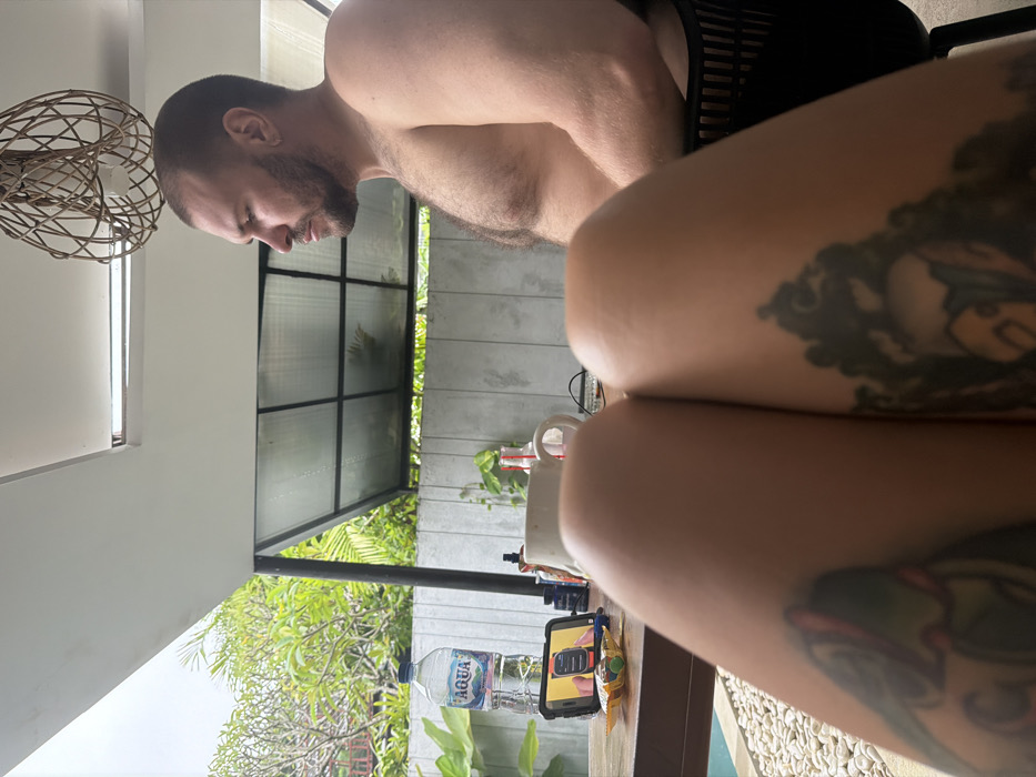 A man is seen shirtless, looking down with a beard. Seated near him is a person with tattoos on their legs. In the background, there's an outdoor area with greenery and a windowed wall. A table holds a water bottle, a phone, a mug, and what appears to be a snack. The scene is lit by natural light.