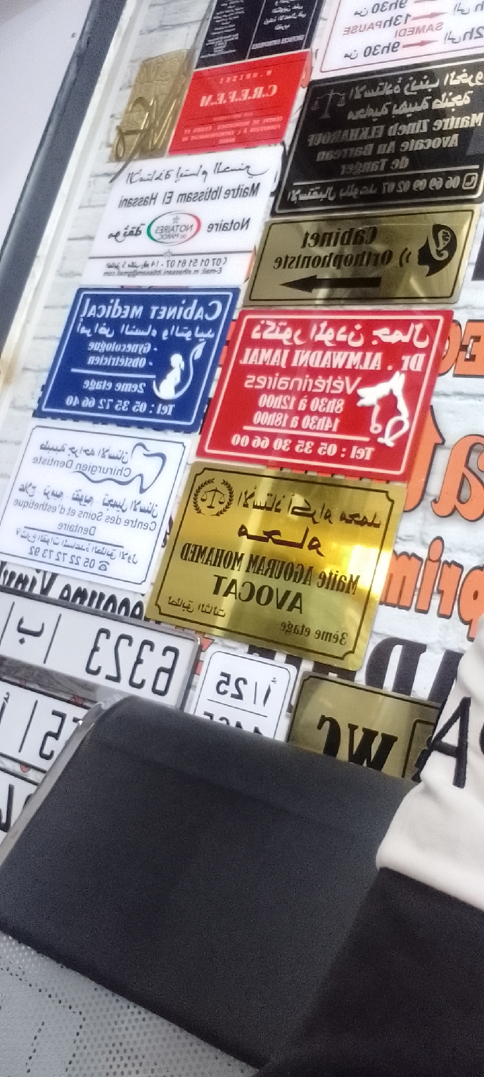 The image depicts a wall adorned with numerous professional plaques and vehicle license plates, viewed from an upward angle. The location is a city in Morocco, likely Rabat or Sale. The plaques are rectangular, varying in size and color (gold, silver, white, blue, red, black), and display mirrored text primarily in Arabic and French. These signs indicate various professions, including notary, medical cabinet (obstetrics/gynecology), veterinarian, orthodontist/speech therapist, lawyer, and dental surgeon, often accompanied by corresponding professional symbols (e.g., scales of justice, caduceus, animal silhouette, tooth). Interspersed among the plaques are several Moroccan vehicle license plates, featuring both Arabic and Latin script. In the foreground, occupying the lower portion of the frame, is the back of a black, textured car seat or similar padded surface. To the immediate right of this object, a person's right arm and shoulder are partially visible, clad in a white sleeve with black lettering. The wall behind the signs is white and appears textured. No discernible actions or interactions are occurring.