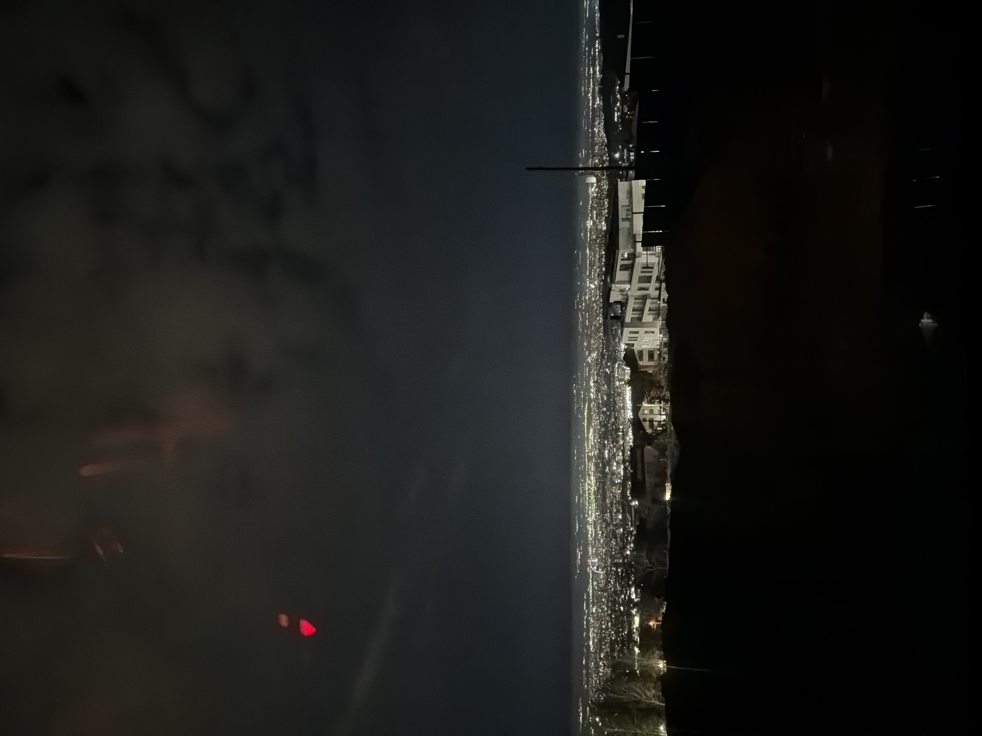 night view of Sofia, Bulgaria. The city lights stretch horizontally across the frame, transitioning from brightly lit urban areas to a dark, cloudy sky. In the foreground, portions of buildings and structures can be seen in silhouette on the right side of the image. A pole or vertical structure is visible near the center of the image, standing out against the cityscape. The sky is dark and hazy with some indistinct shapes that might be clouds. A red light is visible in the foreground on the left side of the image.