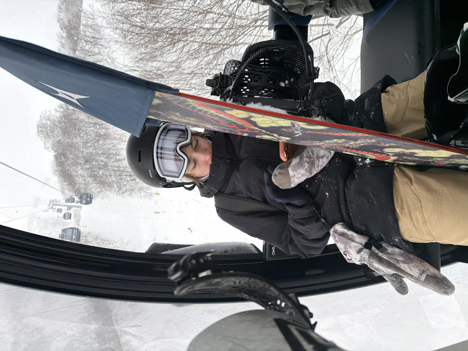 - "Inside a ski lift, a person wearing a helmet and goggles is seated, holding a snowboard" by FM-qanlk2, licensed under CC BY 4.0