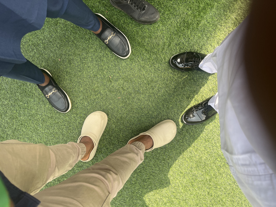 This overhead image depicts four individuals standing on artificial green turf in Ilado, Nigeria, with their feet angled towards the center of the frame, forming a loose cluster