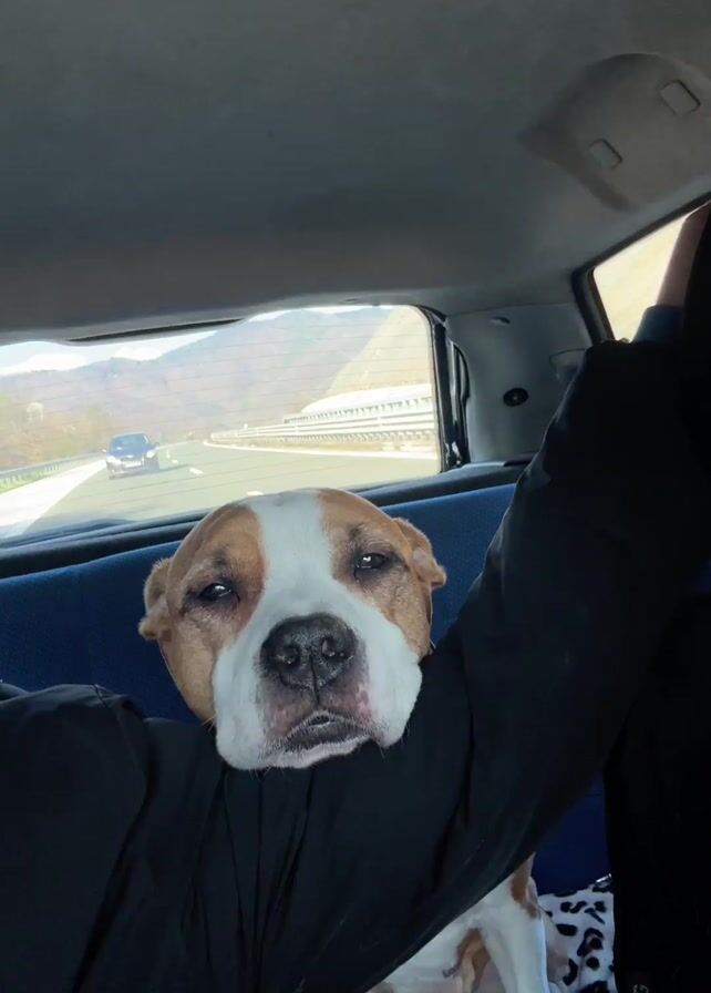 A person holds their arm up and in front of their face while driving in a car, allowing a brown and white dog to rest its head on their arm. The dog appears calm, and the driver seems to be looking at the dog while recording the video. The car is driving on a highway with a guardrail on one side and a car visible in the distance.