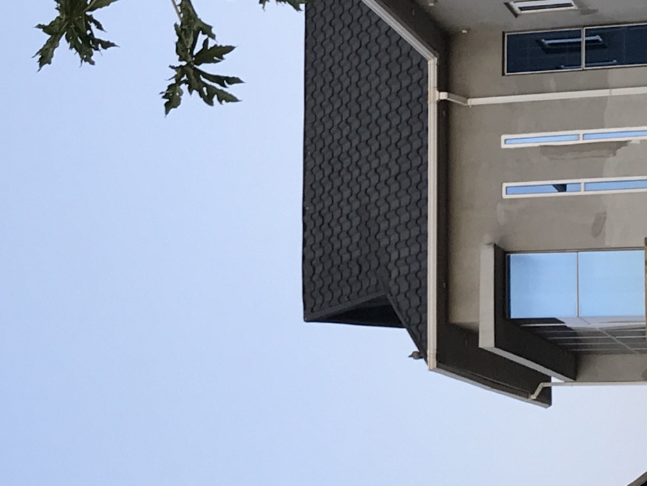 A building with dark, patterned roofing is captured from a low angle against a clear blue sky. A patch of green leaves and branches is visible in the upper left corner. The building has a modern design with grey walls and blue-tinted windows. A gutter and several small windows are visible on the side of the building. A bird can be seen perched on the building’s edge.