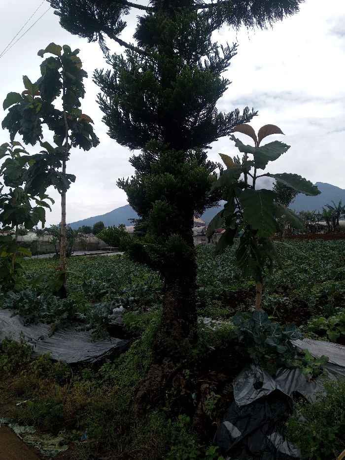 This image depicts an agricultural scene in Bangtsho, Bhutan, under an overcast sky. In the foreground, a prominent dark green conifer-like tree stands slightly right of the center, its dense foliage extending upward out of frame. To its immediate left, a deciduous tree with large, dark green leaves and a slender trunk rises. Further left, another similar tree with broad leaves is partially visible. The ground immediately below and around these trees is covered with a mix of wild green vegetation and exposed soil. To the right of the conifer, a young plant with broad, lighter green leaves is visible. The midground features an extensive cultivated field, densely planted with green leafy vegetables, consistent with brassicas such as cabbage or broccoli, arranged in rows. Sections of this field are covered with black plastic sheeting, used as mulch. At the bottom right, crumpled black plastic material is visible on the ground. In the background, the cultivated fields extend towards a distant line of low-rise structures, possibly greenhouses or agricultural buildings. Beyond these structures, a series of dark blue-green mountains rise, partially obscured by atmospheric haze or clouds. The sky above is entirely overcast, displaying a light grey tone with visible cloud formations, indicating diffused lighting conditions with no direct sunlight. No people or animals are visible in the scene, and no specific actions or interactions are depicted.