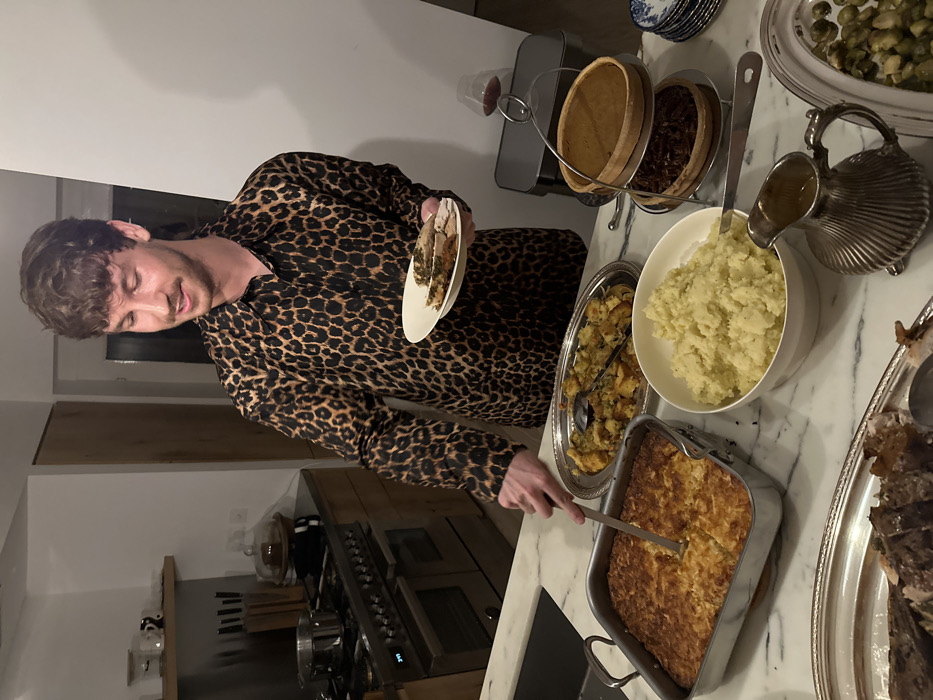A man in a leopard-print outfit stands at a table laden with food. He holds a plate with sliced meat. The table contains mashed potatoes with gravy, stuffing, cornbread, two pies on a tiered stand, and a serving dish of what appears to be brussel sprouts. An oven and other kitchen appliances are visible in the background.