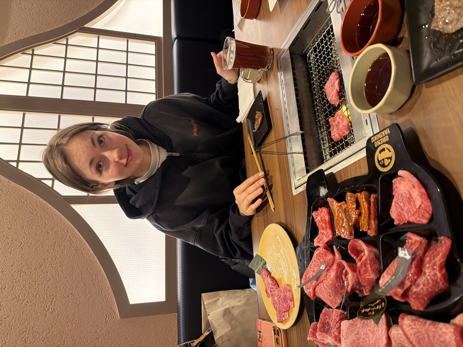 A female individual is seated at a wooden table in a yakiniku restaurant, identified as OHENO YAKINIKU in Taito, Japan