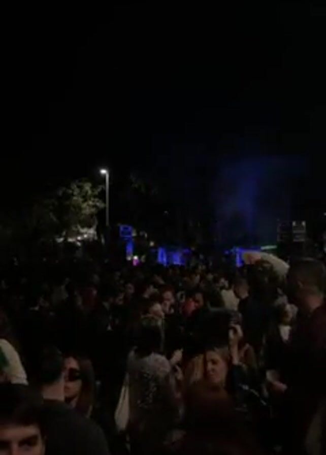 large crowd of people at night, likely at an outdoor event or party. The crowd appears densely packed, with individuals standing close to one another. The lighting is predominantly dark, but a stage area is visible in the distance, illuminated by blue and red lights, possibly with smoke or haze effects. The crowd seems to be focused towards the stage, and some people can be seen moving or dancing to music. There is at least one street light visible. The atmosphere appears energetic and festive.