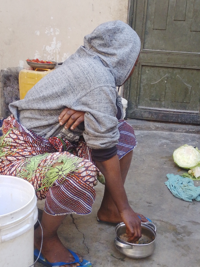 A person in a gray hoodie and colorful patterned skirt sits near a white bucket. They are mixing something in a silver bowl with their hand. A yellow container and a dish of red peppers are behind them. Next to them, a halved cabbage and a light blue cloth sit on the ground near a green door. They wear blue flip-flops. The scene appears to be outdoors, possibly in a courtyard or backyard.