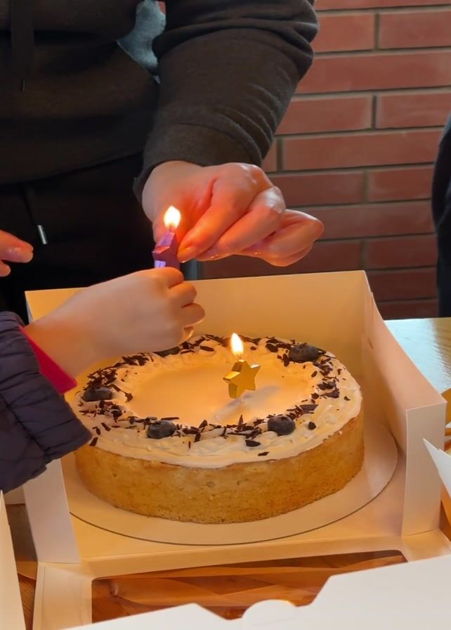 A person in a gray long-sleeved shirt and a child in a blue jacket with pink trim are lighting candles on a cake. One candle is already lit and in the shape of a gold star, and they are using a purple lighter to light two more candles. The cake is in a white box and is round, with a golden crust and a white frosting topped with chocolate shavings and blueberries. The background includes a brick wall and a wooden table. A person wearing black is seated at the edge of the frame.