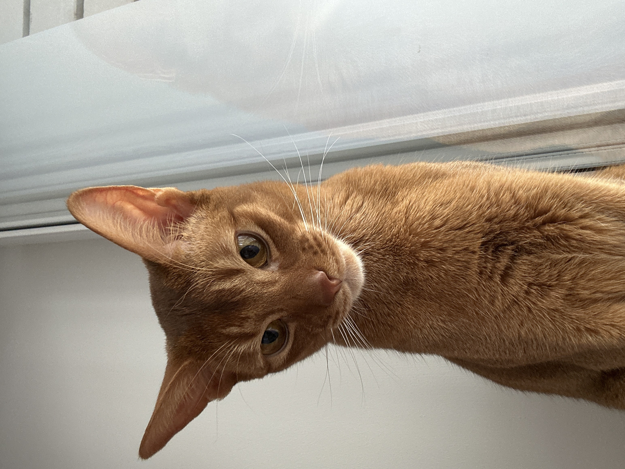 A close-up, angled view of an orange cat's head. The cat's face fills the majority of the frame, with its head tilted to the left. The cat has golden eyes, a pink nose, and long white whiskers. The background is predominantly white, with a slightly reflective surface at the top, possibly a window or tabletop. The cat appears to be indoors. There is no evidence to indicate this photo was taken in Kazan, Russia.
