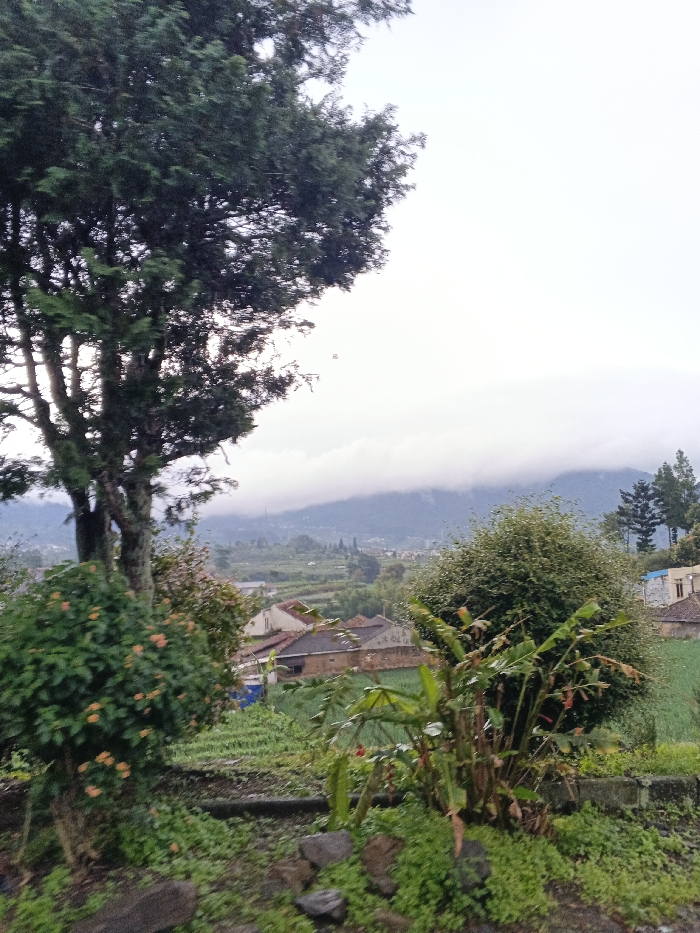 The scene depicts an exterior landscape view in Sindangjaya, Indonesia, under an overcast sky. A prominent, large dark green tree with a substantial trunk is positioned on the left side of the foreground, partially cropped. The lower foreground features dense green ground cover, including smaller bushes with orange flowers and scattered rocks. In the midground, a valley or depression contains multiple residential structures with reddish-brown tiled roofs and light-colored walls, interspersed within cultivated green fields or terraced vegetation. The background is dominated by a distant mountain range covered in green foliage, with the upper peaks obscured by a thick, horizontal band of white clouds or fog. The sky above the cloud line is uniformly bright grey. No individuals, animals, or specific actions are discernible within the frame.