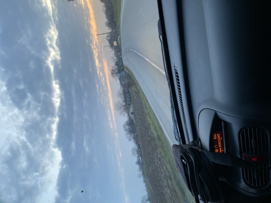 The image presents a forward-facing view from inside a vehicle, indicating travel through the village of Pristoe, Bulgaria. The vehicle's dark-colored dashboard occupies the lower portion of the frame. A black fabric bag rests on the left side of the dashboard. The central console's digital display shows "18:17," "6.0," and "FM HORIZONT." A red warning indicator light is illuminated near the lower-left air vent. Outside the vehicle, a two-lane asphalt road, appearing wet, features a solid white center line and curves gently to the right. To the left of the road, a cultivated field is visible, bordered by bare deciduous trees and scattered single-story houses. The right side of the road is lined with utility poles and additional bare trees. The sky is predominantly overcast with grey clouds, and a distinct band of orange and pink light is present along the horizon on the right side, consistent with a sunset or dusk scene.