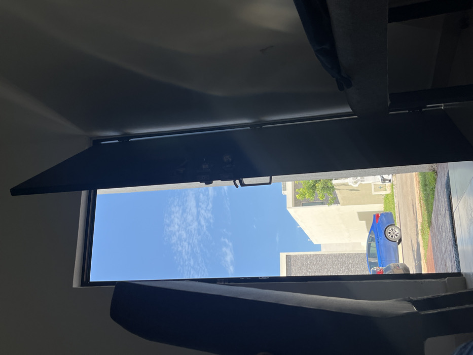 The image depicts a low-angle view from a dimly lit interior space looking through a partially open doorway to a brightly lit exterior scene in Komchén, Mexico. On the left, a dark-colored, upholstered chair or furniture item is partially visible in the foreground. The prominent dark-colored door, possibly metal or heavy wood, is ajar towards the right, revealing a clear blue sky with scattered white clouds. The door exhibits visible hinges and a handle on its left edge. Through the doorway, a residential environment is visible. A light blue four-door sedan is parked on a paved street in the middle ground, its right side facing the viewer. The rear of a darker vehicle is partially visible to the immediate left of the blue sedan. Modern residential buildings with light-colored, possibly beige or off-white, walls and flat roofs are situated along the street. Green foliage from a tree is visible between structures on the right side of the exterior view. The immediate foreground outside the door shows a threshold leading to a small strip of grass before the paved surface of the street. The interior remains significantly shadowed, contrasting with the sunlit exterior. No individuals are visible.
