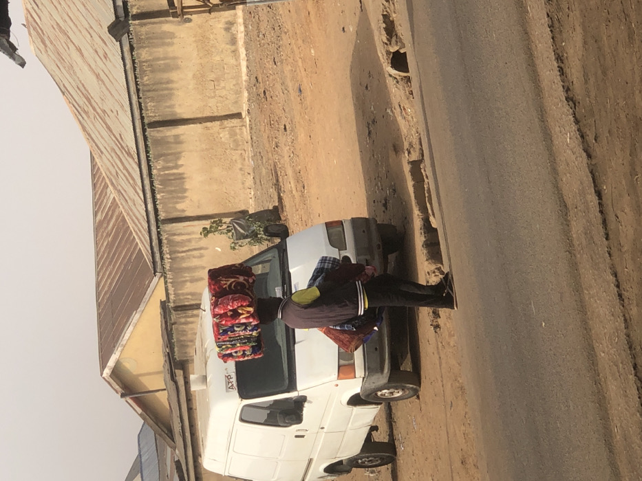 A man stands next to a white van on a dusty roadside. He carries a large stack of blankets on his head. The blankets are a mix of colors and patterns. The van is parked near a building with a metal roof. The road is next to a dirt area. The man is wearing dark pants, a jacket, and dark shoes. A yellow item is visible near his shoulder. The scene appears to be in a developing country.
