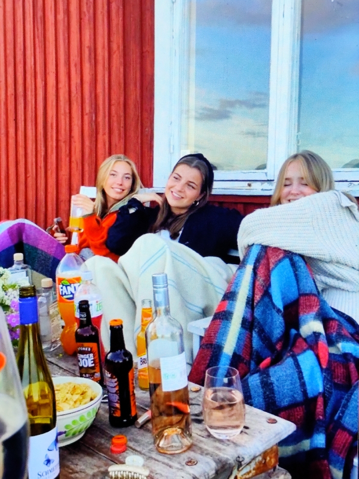 Three young adult females are seated outdoors on a porch or patio in Otta, Norway