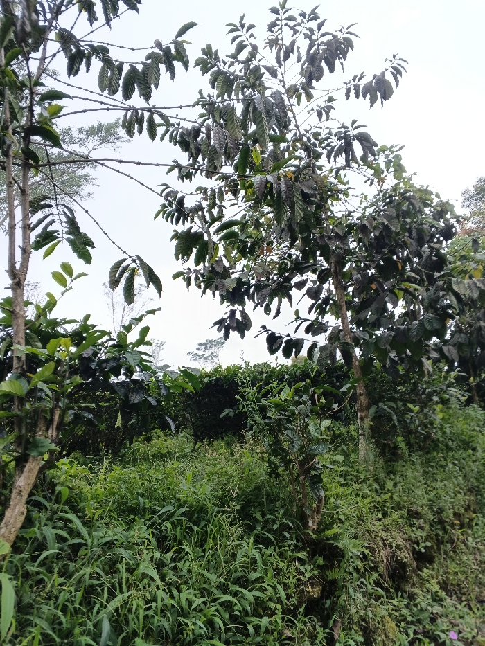 The image depicts a dense, verdant agricultural area, consistent with a coffee plantation, located in a rural or hillside sector of the city of Unknown, Vietnam