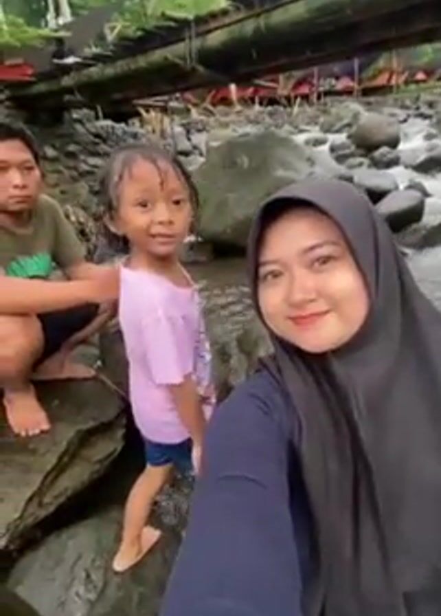A woman in a dark blue long-sleeved shirt and black hijab takes a selfie video in front of a flowing river. A small child with wet hair stands to the left of the woman. An adult male sits nearby on some rocks. Behind them is a low bridge. A tented structure with lighting is visible above and to the right of the frame. The woman stands in the water, which rushes around her. She makes a peace sign with her hand, then speaks to the camera. She looks to the right and then back at the camera.
