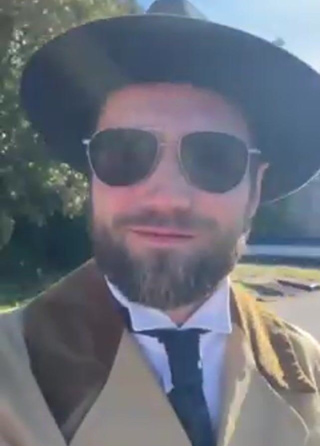 A man wearing sunglasses, a hat, a tie and a coat stands outside in front of what appears to be a building. He faces the camera with a serious expression, then smiles. He is surrounded by what looks like other people nearby. The camera then pans down to the ground, which is a gray surface.