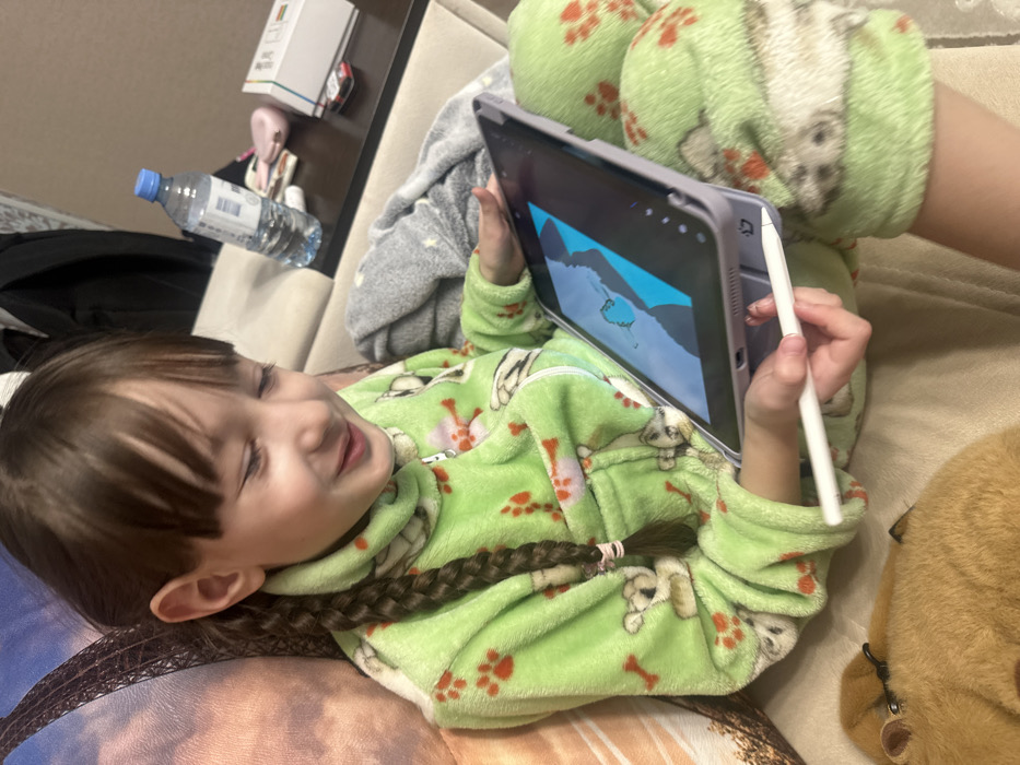 A young female child with dark brown hair, featuring bangs and a long, single braid secured with multiple light-colored bands, is seated indoors on a light-colored upholstered surface. She is wearing light green fleece pajamas adorned with a pattern of brown and white koala bears, orange paw prints, and bones, and a partial front zipper. Her facial expression indicates engagement or amusement, with a slight smile as she looks down at a dark-colored tablet held in both hands. The tablet is encased in a light grey protective cover. Her right hand also holds a white stylus, positioned as if interacting with the tablet's screen. The tablet screen displays an image with a light blue background, a darker blue triangular shape, and a lighter blue, possibly abstract, figure. To the child's left, a decorative pillow featuring an image of the Eiffel Tower is visible. In the lower-left foreground, a portion of a light brown plush object is present. In the background to the right, a dark brown flat surface, likely a table, holds a clear plastic water bottle with a blue cap, a small pink object, a white rectangular box with faint markings, and a small red and white box. A plain, light-colored wall is visible behind the table, with a dark bag or backpack partially visible further in the background. The scene depicts an indoor, residential-like setting. The specific city of Aktanysh, Russia, cannot be visually confirmed from the provided image.