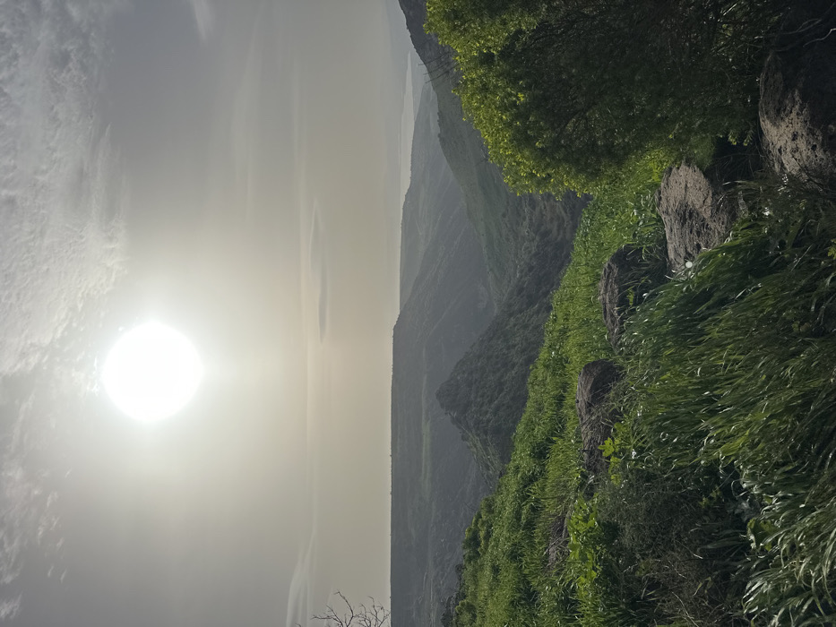 The image depicts a panoramic landscape view over a valley in the Golan Regional Council, Israel, under bright daylight. The sun, a brilliant white orb, dominates the upper-left quadrant of a hazy, light gray sky with scattered thin clouds and a prominent elongated lenticular cloud in the mid-sky. The foreground consists of a steep, verdant hillside covered in tall, lush green grasses and scattered dark brown rocks. A section of a leafy green bush is visible on the far right, and a bare branch protrudes from the far left. The midground features a deep valley with heavily vegetated hillsides, including a distinctive conical, dark green hill rising from the valley floor towards the center-left. Further into the background, undulating green terrain gives way to a flatter, distant landmass. A large, hazy body of water, likely the Sea of Galilee, is visible on the horizon line between distant land and sky, appearing as a lighter blue-gray expanse. No individuals, animals, or clear man-made structures are identifiable within the frame.