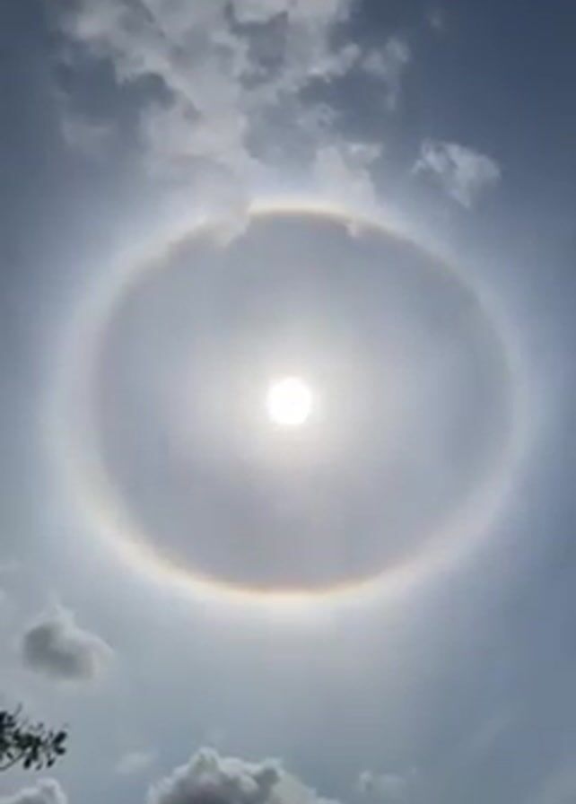 A vertical video shows the sun in the sky, surrounded by a circular rainbow