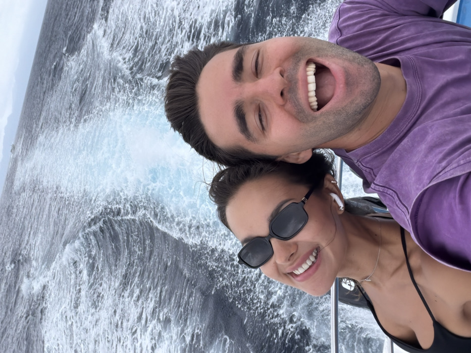 A selfie-style photograph depicts two individuals on a boat, observed from the chest up, with a prominent boat wake in the background on open water