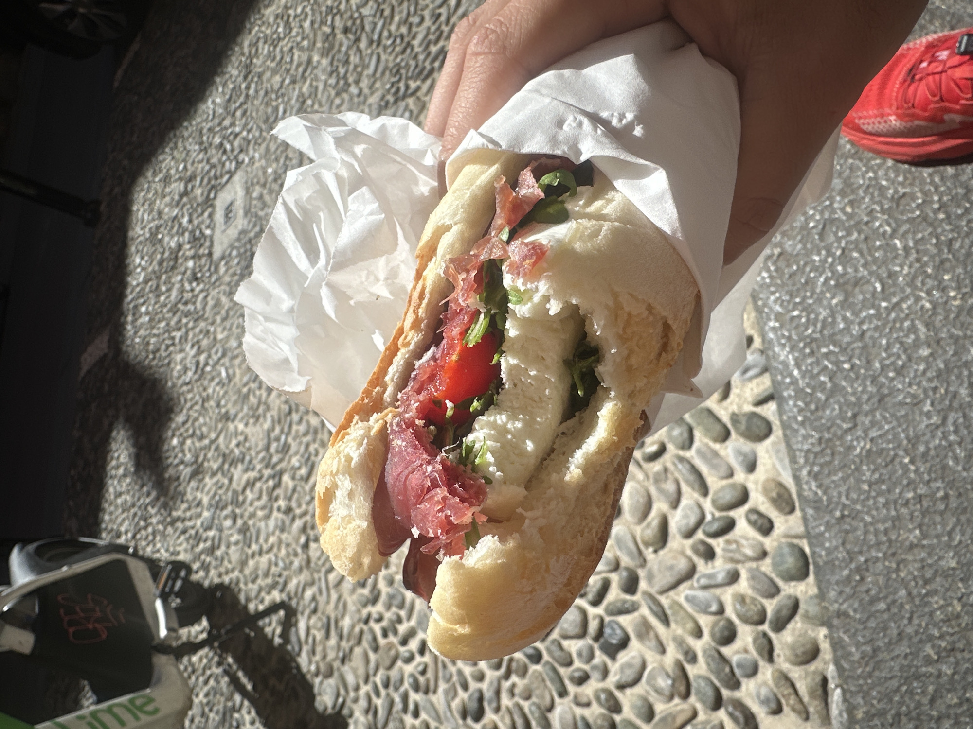 A person holds a sandwich wrapped in white paper, filled with mozzarella, tomato, prosciutto, and greens. A red sneaker is visible to the right. The background is a cobblestone pavement. A black and green Lime scooter is partially visible in the lower left. The location is suggestive of Milan, Italy, based on the typical ingredients of the sandwich and the prevalent cobblestone pavement often found in Italian cities.