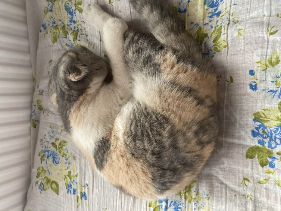 - "A curled-up calico cat rests on a floral-patterned blanket" by FM-SShF13, licensed under CC BY 4.0