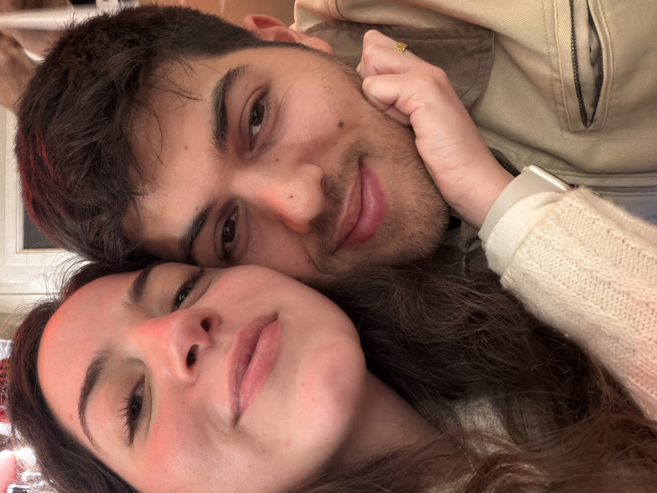 A young couple poses closely for a selfie. The man, fair-skinned with dark hair and a beard, looks at the camera with a slight smile. A ring is visible on his hand, which rests on his face. Beside him, a fair-skinned woman with long brown hair gazes into the distance. Both appear relaxed and content. They are dressed in casual clothing, including a jacket and sweater. The lighting is soft and warm.