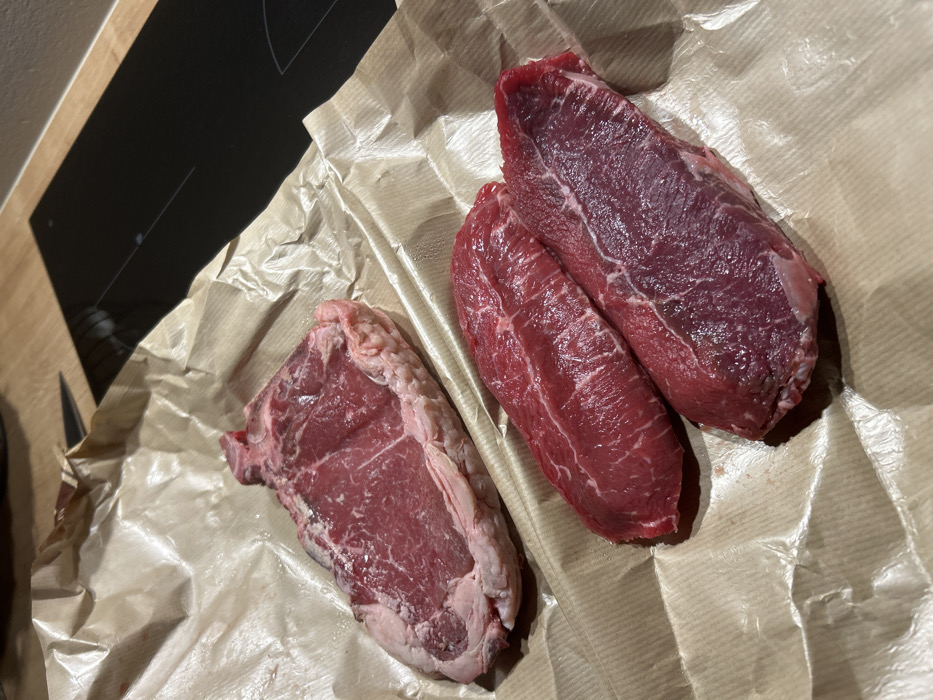 - "The image displays three raw cuts of meat resting on a crumpled sheet of brown butcher paper, positioned on a light-colored wooden countertop" by FM-u366Z2, licensed under CC BY 4.0