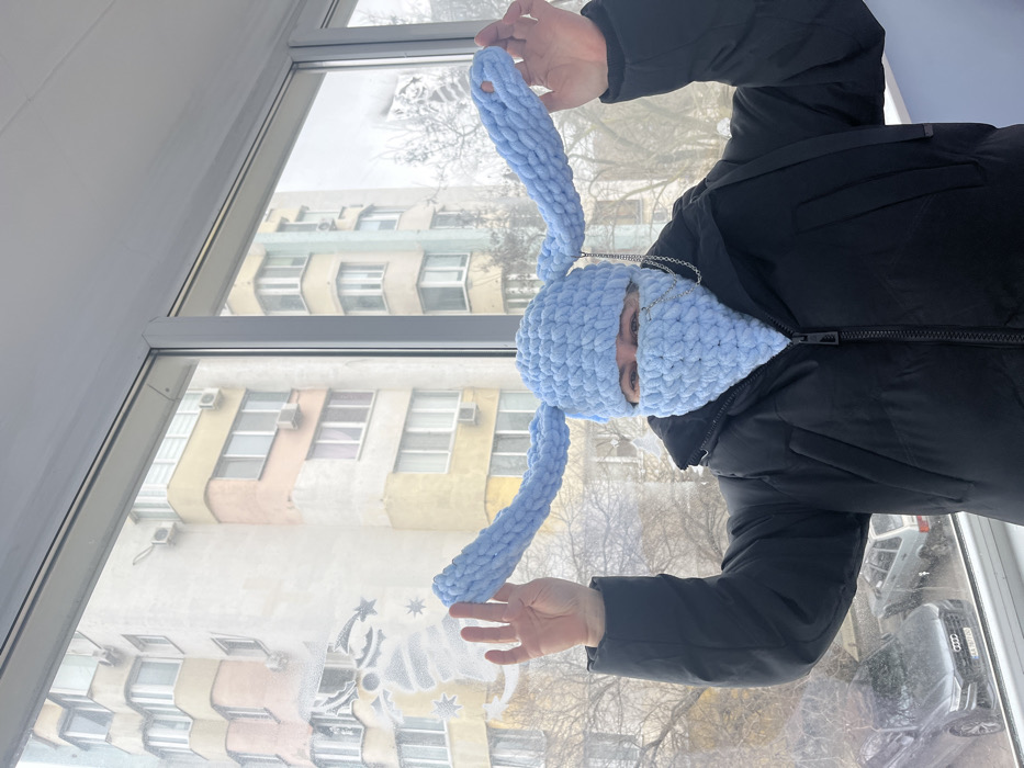 - "A subject, whose face is largely obscured by a chunky, light blue knitted balaclava-style hat with long, horizontally extended bunny ears and a matching lower face covering, is depicted indoors, looking towards the camera" by FM-aeu8u2, licensed under CC BY 4.0