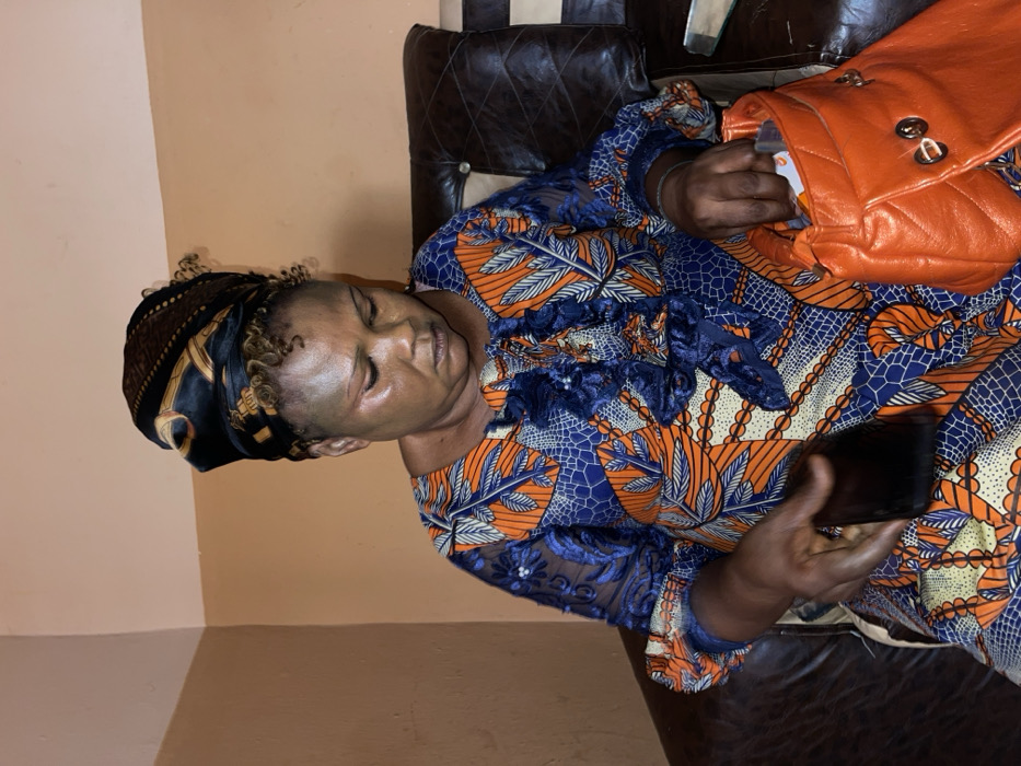 An adult female is seated indoors in Unguwar Gabas, Nigeria, on a brown, tufted leather sofa