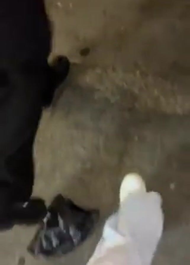 Two people are standing on a concrete sidewalk. One person is wearing black pants and shiny black shoes. The other person is wearing white pants and white shoes. A black plastic bag is on the ground near the person in black pants. The person in black pants walks away.