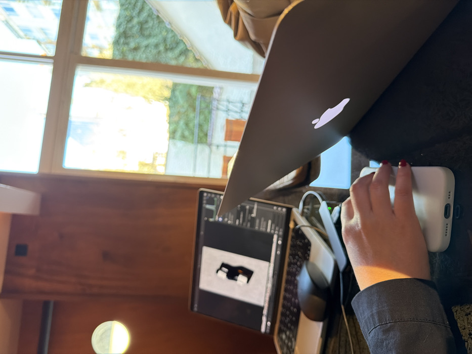The scene depicts an indoor environment in the city of Bruxelles, Belgium. A person's right hand, adorned with red nail polish, manipulates a white portable electronic device, possibly a smartphone, featuring a USB-C port and speaker grilles. To the left of the hand, an open silver laptop, identified as a MacBook, displays what appears to be design software with a prominent black and white geometric render. A black wireless mouse rests beside this laptop, connected via a grey USB hub that illuminates a green indicator light. A second, partially open MacBook is positioned to the right, angled to reveal its lid with the illuminated Apple logo. All devices are situated on a dark, reflective surface. The background consists of a large multi-pane window through which bright natural light enters, revealing green foliage, a light-colored building with orange elements, and a bright sky outside. A wooden paneled wall with a circular wall-mounted light fixture is visible on the far left.