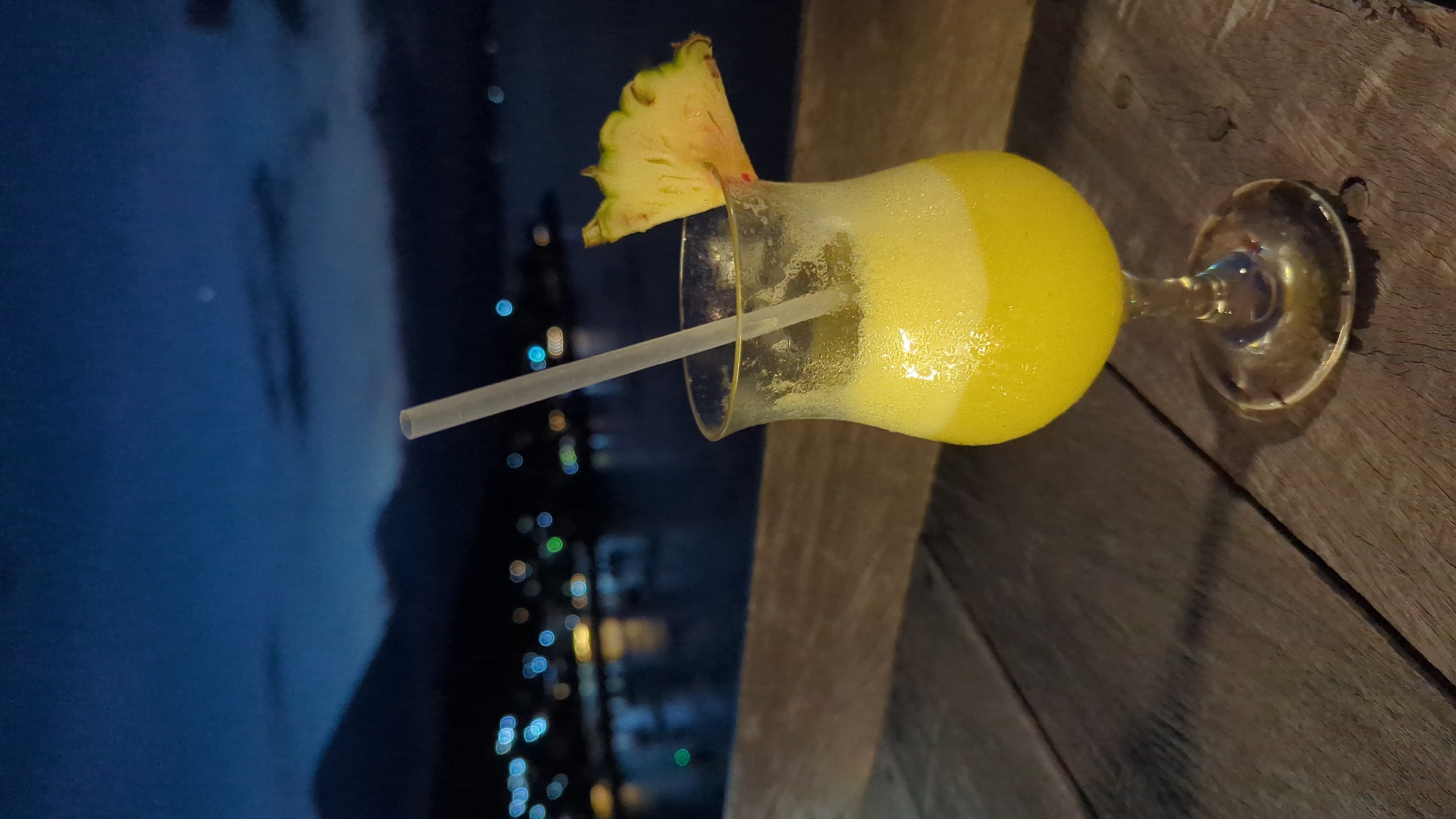 A cocktail, likely a Piña Colada, sits on a wooden surface