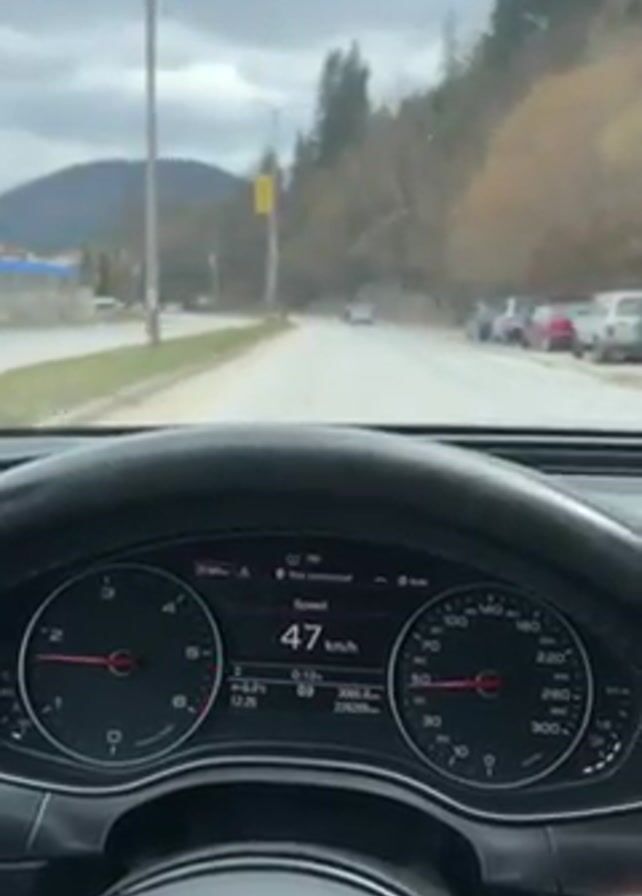 A driver accelerates on a winding, two-lane road under a cloudy sky. The vehicle's dashboard displays increasing speed, and trees and parked cars line the road's side. In the distance, a mountain can be seen. The scene is filmed from the driver's perspective.