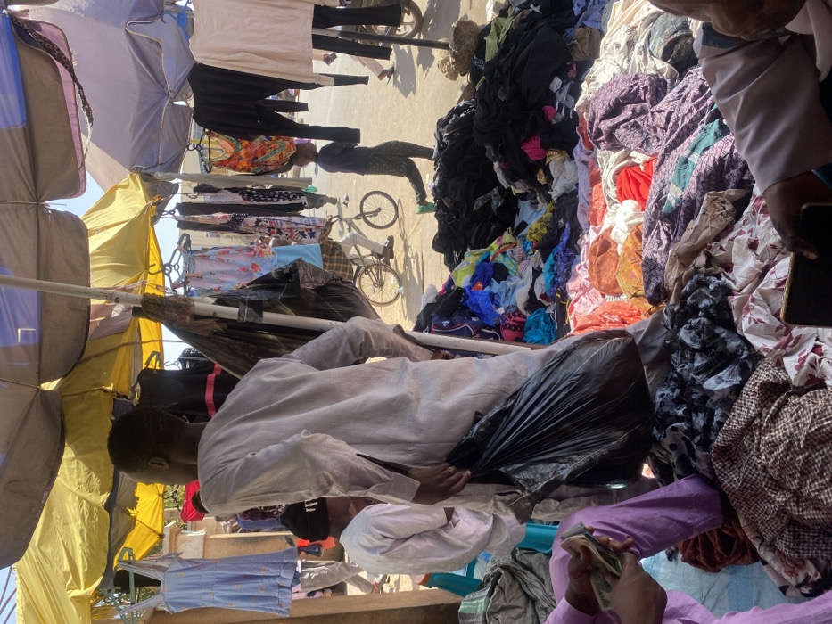 An outdoor market scene in Sabon Gari South, Nigeria, is depicted under bright daylight, partially shaded by multiple large market umbrellas (yellow and blue/grey). In the foreground, a person's left hand, clad in purple attire, holds a fanned stack of currency notes. Adjacent, a person seen from behind wears a light-colored, long-sleeved tunic and holds a large black plastic bag with both hands, positioned over a dense pile of multi-colored garments covering the ground. Another individual in a white tunic and black knit cap is partially visible in the mid-left, also near clothing piles. The background features various hanging garments on display, including dresses, under the umbrellas. A paved or dirt path separates the foreground activity from further market elements. A young child in a dark shirt and patterned trousers with bright green footwear walks right-to-left across this path. Further back, a person rides a bicycle from left-to-right. Other indistinct figures are present in the deeper background, indicating a bustling environment.
