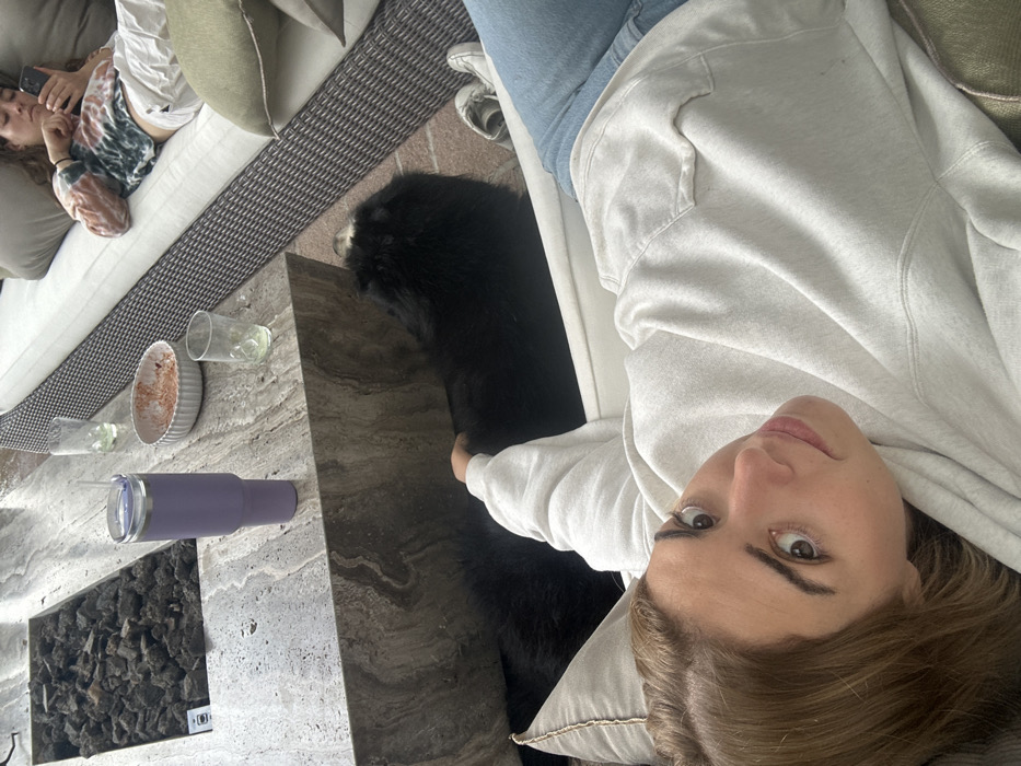The image depicts a casual outdoor or semi-outdoor lounge area in Avandaro, Mexico. In the foreground, a woman with light brown hair, wearing a light grey long-sleeved shirt and blue jeans, is positioned from the chest up, lying on a white cushioned surface, looking towards the camera. Her right arm extends towards a large, black, fluffy dog that is resting on the light-colored tiled floor. Beyond the dog, a rectangular stone table or fire pit with a recessed area filled with dark, rough rocks is visible. On the table's surface, a tall, purple insulated tumbler with a straw stands centrally, flanked by a small white ribbed bowl containing light-colored residue and two empty clear drinking glasses. In the background, another woman with light brown, curly hair is observed lying on a white cushioned wicker sofa. She is dressed in a tie-dye long-sleeved crop top and white shorts, actively using a mobile phone held in both hands. A pair of light-colored casual shoes are on the tiled floor near the sofa.