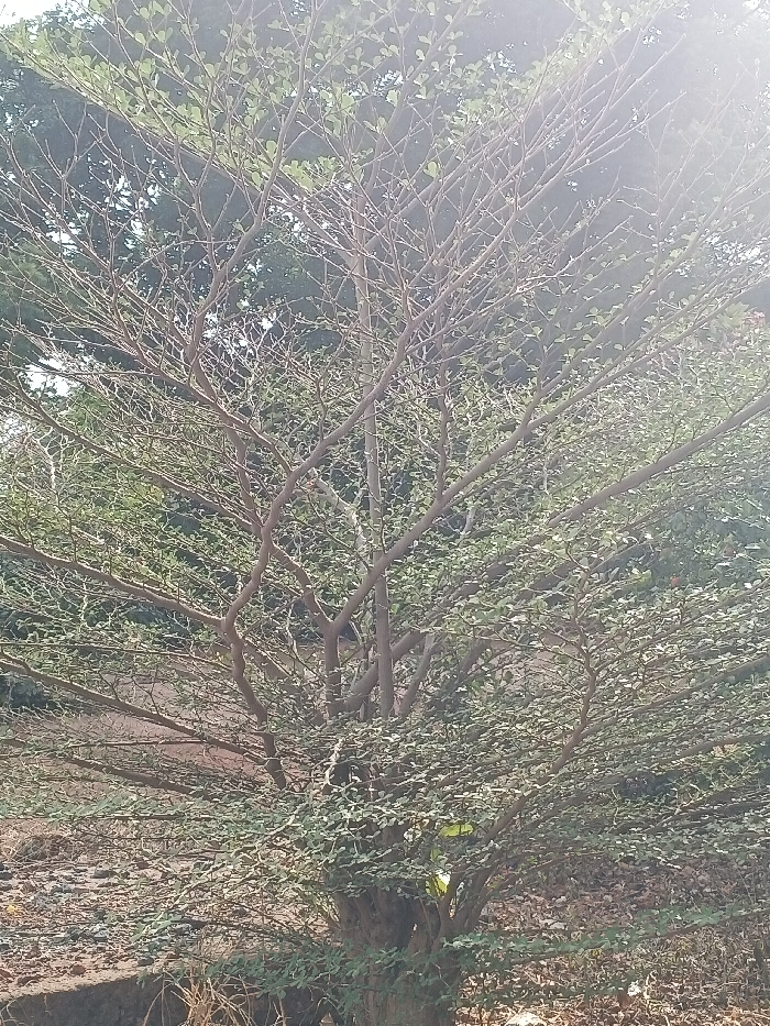 The image displays an outdoor scene in Nsukka, Nigeria, centered on a deciduous tree with a dense network of branches. The tree exhibits both bare branches and numerous small, green, ovate leaves, suggesting a transitional state. The ground beneath and behind the tree consists of dry, reddish-brown soil interspersed with sparse, withered vegetation. In the lower-left foreground, a dark, low-lying concrete or stone structure is partially visible. The background features denser, darker green foliage, indicative of additional trees or shrubs. The scene is illuminated by bright ambient light, producing a significant lens flare that manifests as a white haze across the upper and central portions of the image, impacting visual clarity. No individuals or discernible actions are present.