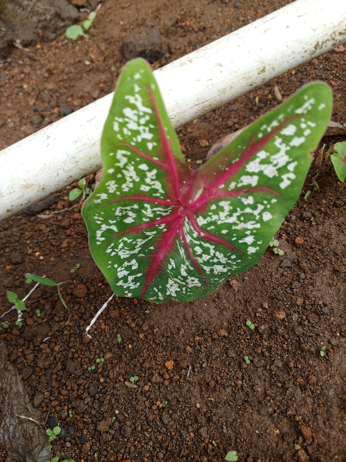 - "A single Caladium leaf, exhibiting a green lamina with prominent dark pink vascular veins radiating from the center and irregular white mottling, is positioned low to the ground" by FM-rm1rm2, licensed under CC BY 4.0
