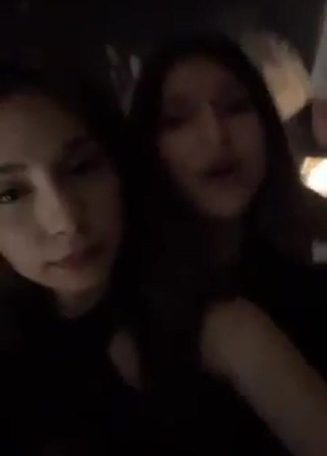 Two young women are in a dimly lit club setting. They start by lip-syncing and looking at the camera, then the camera angle shifts to show a group of people dancing, drinking, and interacting in the background. The women are dressed in dark clothing. The environment appears to be a crowded nightclub or party.