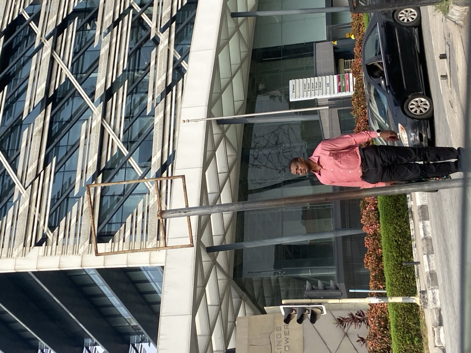 The scene depicts an urban environment in Falomo, Nigeria, dominated by a modern high-rise building. In the foreground, a Black male individual stands facing forward, positioned slightly to the right of a tall, rusty metal pole with a rectangular frame at its top. He wears a long-sleeved pink button-down shirt, dark trousers, and a dark belt. A watch is visible on his left wrist, and he appears to hold a dark object in his left hand. To the left of the man, a black traffic light pole with a three-light signal box is visible. Behind the man, a landscaped area features low green hedges and reddish-brown shrubs. A black sedan, resembling a Toyota Camry, is partially visible on the road to the right, with a driver distinguishable within the vehicle. The background is occupied by a multi-story, contemporary building with a glass facade, featuring a prominent pattern of horizontal and diagonal sunscreens or decorative elements. The base of the building is light-colored, with a canopy-like structure extending outwards. The words "KINGS TOWER" are partially visible on a sign at the bottom left of the building. To the right of the standing man and beneath the building's facade, a tall, slender flagpole stands, and a vertical white sign displaying "Microsoft" logos and other text is present. The scene is illuminated by bright daylight.