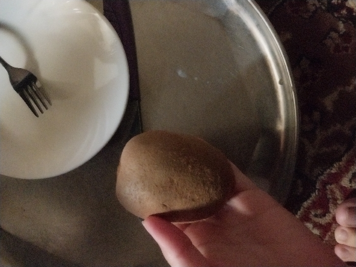 An indoor scene in al-Qarara, Palestinian Territory, is depicted from an overhead angle. A fair-skinned human hand on the left holds a single brown, fuzzy kiwi fruit. Below the hand, the toes of a human foot with visible toenails rest on a dark-colored rug featuring a traditional red and off-white patterned design. In the upper right quadrant, a round white plate is present, upon which a dark-colored, four-tined fork is positioned with its tines facing the upper left. Both the plate and the area beneath the kiwi and hand are set on a large, round metallic tray.