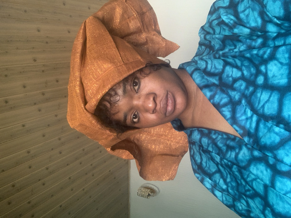 This image depicts a medium close-up portrait of a dark-skinned individual, identified as female, positioned indoors in Barakin Akawo, Nigeria. The subject looks directly at the camera with a neutral expression, exhibiting dark eyes enhanced with eyeliner, dark curly hair visible at the hairline, and full lips. She wears a voluminous, elaborately tied headwrap in a shimmering bronze or copper fabric, and a loose-fitting garment featuring a blue and black tie-dye or batik pattern. The background consists of a light-colored wooden paneled ceiling, angled from top-left to bottom-right, and a plain light-colored wall. A small, reflective wall fixture is partially visible on the upper left portion of the wall.