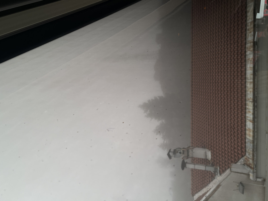 The image captures an exterior scene in Cetinje, Montenegro, viewed through a window on a heavily fogged day. The upper right section of the frame is partially obstructed by a dark, vertical window frame or shutter. The window's glass surface exhibits numerous small, dark particulates or moisture spots. The lower half of the image is dominated by a reddish-brown tiled roof, slanting slightly downward from left to right. Positioned on this roof are two metal chimneys; the left one is a plain cylindrical pipe, while the right is more elaborate, featuring a cap and an attached horizontal pipe, showing signs of weathering and discoloration. A rusted metal gutter runs horizontally along the visible edge of the roof, above a light-colored building facade partially visible at the bottom left. Above the roofline, dense fog or low clouds significantly obscure the landscape. Through this atmospheric condition, several dark green coniferous trees are faintly discernible in the midground. Beyond these trees, the contours of hills or elevated terrain are vaguely visible, further muted by the pervasive fog. The sky and distant background appear as an undifferentiated light grey due to the limited visibility. No individuals or specific actions are depicted.