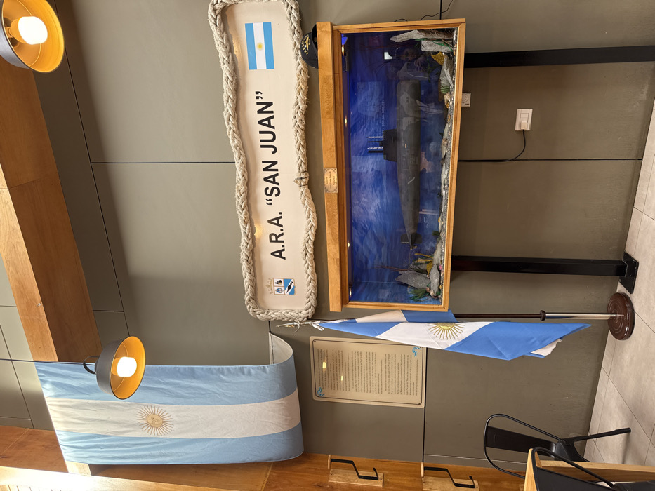 The scene depicts an interior space, identified as being in the city of Tolhuin, Argentina, featuring a memorial display dedicated to the A.R.A. San Juan submarine. The background consists of plain light gray walls and a tiled floor. Overhead, light-colored wooden beams traverse the space, from which two black, inverted bell-shaped pendant lights hang, each emitting warm light. Prominently displayed on the main wall is a large, horizontally oriented sign with a thick rope border. The sign's white face reads "A.R.A. 'SAN JUAN'" in dark, capitalized letters, flanked by a crest on the left and a small Argentine flag on the right. Below this sign, a rectangular wooden-framed display case, approximately 1.5 meters wide, showcases a detailed model of a submarine, likely the A.R.A. San Juan, against a blue background mimicking water, with artificial rock formations and marine plants at its base. This display case rests on two vertical dark metal posts. On top of the display case, a dark cap with "A.R.A. SAN JUAN" embroidered on it is visible towards the right side. To the left of the submarine display, an Argentine flag is presented on a standing pole with a circular wooden base. Above and to the left of this flag, a rectangular informational plaque with text is affixed to the wall. Further left, a wooden panel with multiple hooks (a coat rack) is mounted. A large Argentine flag is draped vertically from the upper wooden beam on the far left, descending towards the floor. In the bottom left corner, part of a wooden table and a black metal chair are visible. A faint reflection of a person is discernible in the glass of the submarine display case. A white electrical outlet and a black cable are visible on the wall behind the right support post of the submarine display. No active people or specific interactions are observed.